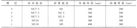 在設計中,滿足《規(guī)程》是基本的要求,但僅從《規(guī)程》出發(fā)進行加固設計存在以下問題:無法體現(xiàn)局部墻體加固后抗震的情況;計算結果粗糙;需采用手算進行統(tǒng)計及計算。因此,在設計方案在設計方案滿《規(guī)程》要求的同時,采用“剛度折算模型方法”,應用“PMCAD——磚混結構抗震驗算”軟件對加固方案進行輔助分析。該方法主要是將混凝土夾板墻按剛度比(彈性模量比)折算為磚墻,同時調(diào)整磚砌體設計密度,以保證恒荷載設計值與實際情況相符。在本工程中,各層磚及砂漿的強度不同(表2),因此各層磚墻的折算剛度不同,層1~5混凝土與砌體剛度比分別為:11.8,11.8,15.6,18.1,23.4計算中層1、2及層3、4、5分別采用剛度比10(<11.8)及15(<15.6)進行分析,即將混凝土夾板墻模擬為厚度增大10、15倍速的磚墻。為保持墻體荷載與實際情況基本相符,算得當混凝土與磚墻剛度比采用10時,磚墻密度取11kN/m3;剛度比采用15時,磚墻蜜度取9kN/m3。